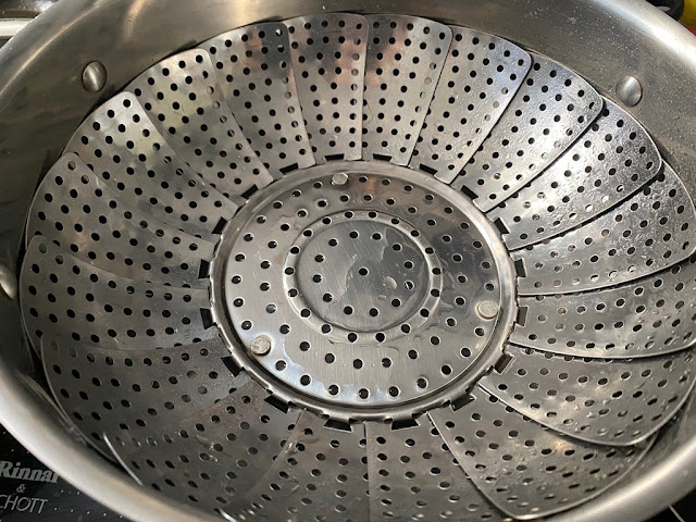 1) 깨끗이 씻은 감자는 채반에 올려 삶아주세요 물에 삶으면 감자의 단맛이 빠지고 감자가 너무 질게 되더라구요. 물이 끓으면 감자를 올려주세요