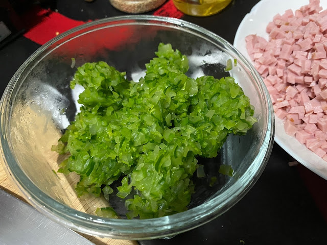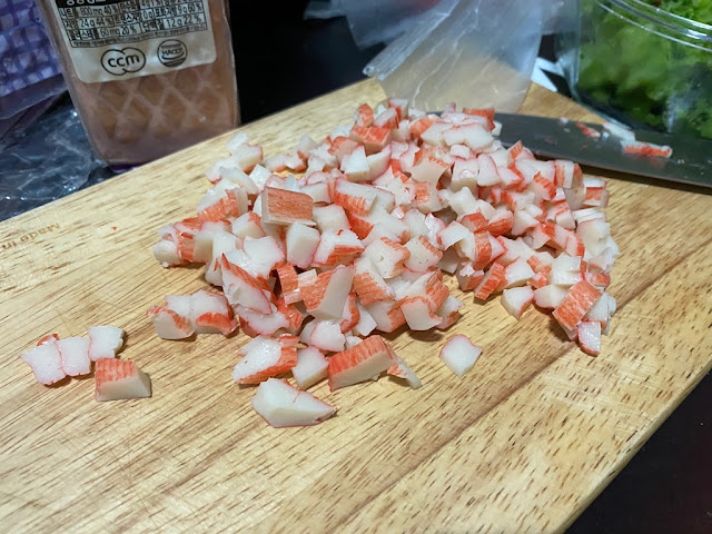 6) 햄과 맛살도 다져줄거에요 햄은 목우촌햄을 썼어요 돼지고기가 93.2%들어가서 거의 다 돼지고기라고 생각하시면 되요 이와 비슷한게 노브랜드햄이랍니다. 가격은 노브랜드햄이 더 저렴해요
