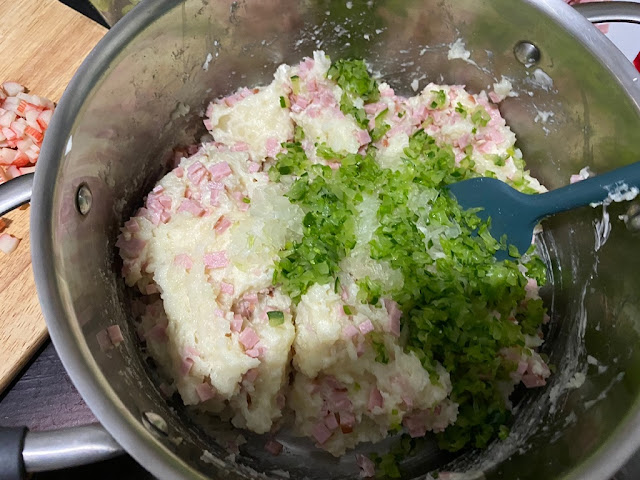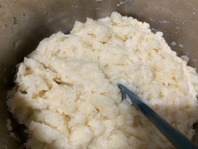 8) 삶아준 감자는 껍질을 벗겨서 으깨줍니다. 감자으깨기를 사용하시면 편한데 없으시면 포크로 열심히 눌러주시거나 절구 방망이로 콩콩 찧어주세요. 이거 하시다 보면 감자 으깨기 사고 싶어질거에요.