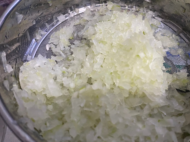 5) 양파도 깨끗이 씻어서 오이와 같은 방법으로 다져주시고 소금을 살짝 푼 물에 담궈줄거에요. 그래야 양파의 매운맛이 빠지고 향이 남아서 먹었을때 입에 양파냄새가 남는 불편함이 없답니다.