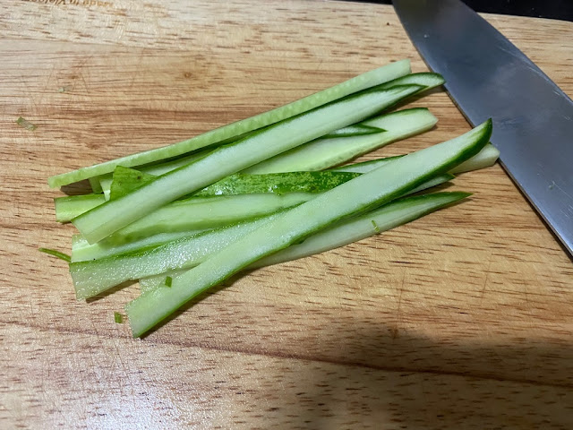 3) 오이는 채를 썰어서 다져줄거에요 다지기를 사용해도되지만 전 직접 다져줄거에요 일정하지 않아도 되요 다졌다는 느낌이면 됩니다.