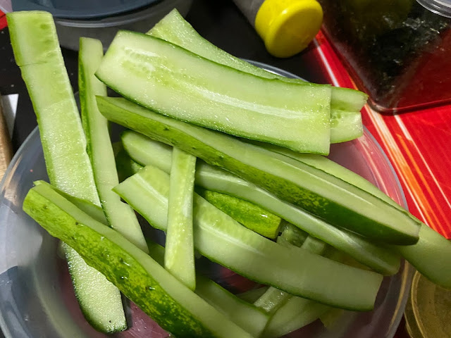 오이를 깨끗이 씻어 씨부분을 피해 잘라주세요. 이쁘게 자르지 않아도 되요