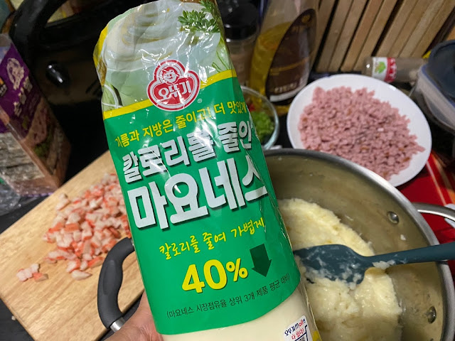 11) 이제 어느정도 잘 섞어졌다면 마요네즈를 넣어주세요 저는 오뚜기 칼로리를 줄인 마요네즈를 썼는데.. 아무래도 고소한 맛은 덜하지만 산듯한 맛이 가벼워서 좋아요. 이때 소금을 살짝 넣어주세요. 이미 야채와 햄에 소금이 있으니 그것을 감안해서 하시면 됩니다.