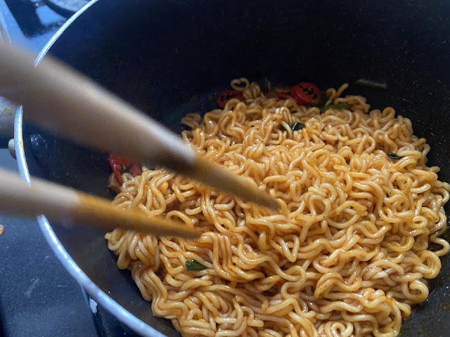 물을 4스푼 정도만 남기고 따라버린 후 분말스프와 조미유를 넣고 잘 비벼서 먹는다.