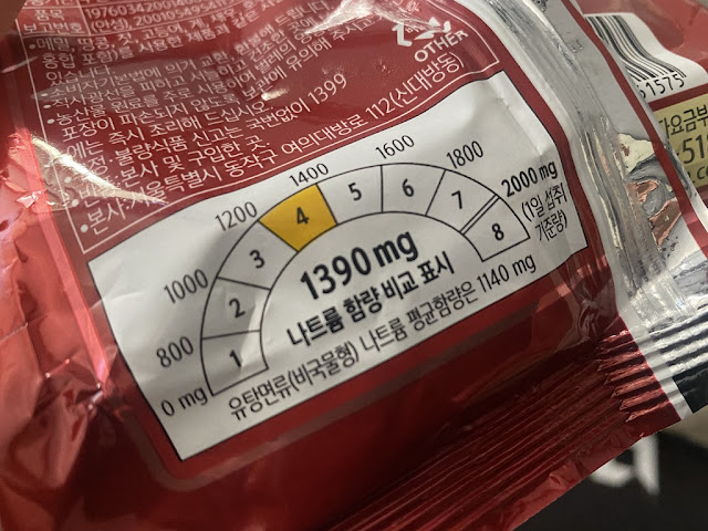처음에는 이게 뭐지하고 봤는데 확실히 나트륨의 함량이 어느정도 인지 한눈에 들어와서 보기가 편해요. 신라면 볶음면은 4등급으로 나트륨 함량이 1,390mg 비국물형 나트륨 평균함량은 1140mg 인데 그에 비해서 250mg이나 더 높네요.