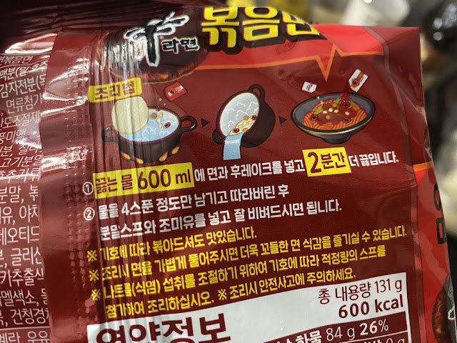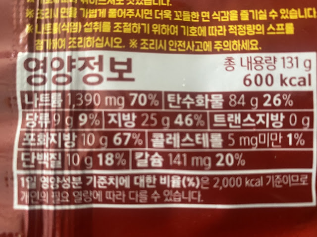 한봉에 131g 열량은 600칼로리 , 볶음면 칼로리가 높기는 하지만 대부분 600칼로리까지는 안가는데 ... 많이 높은 편이에요