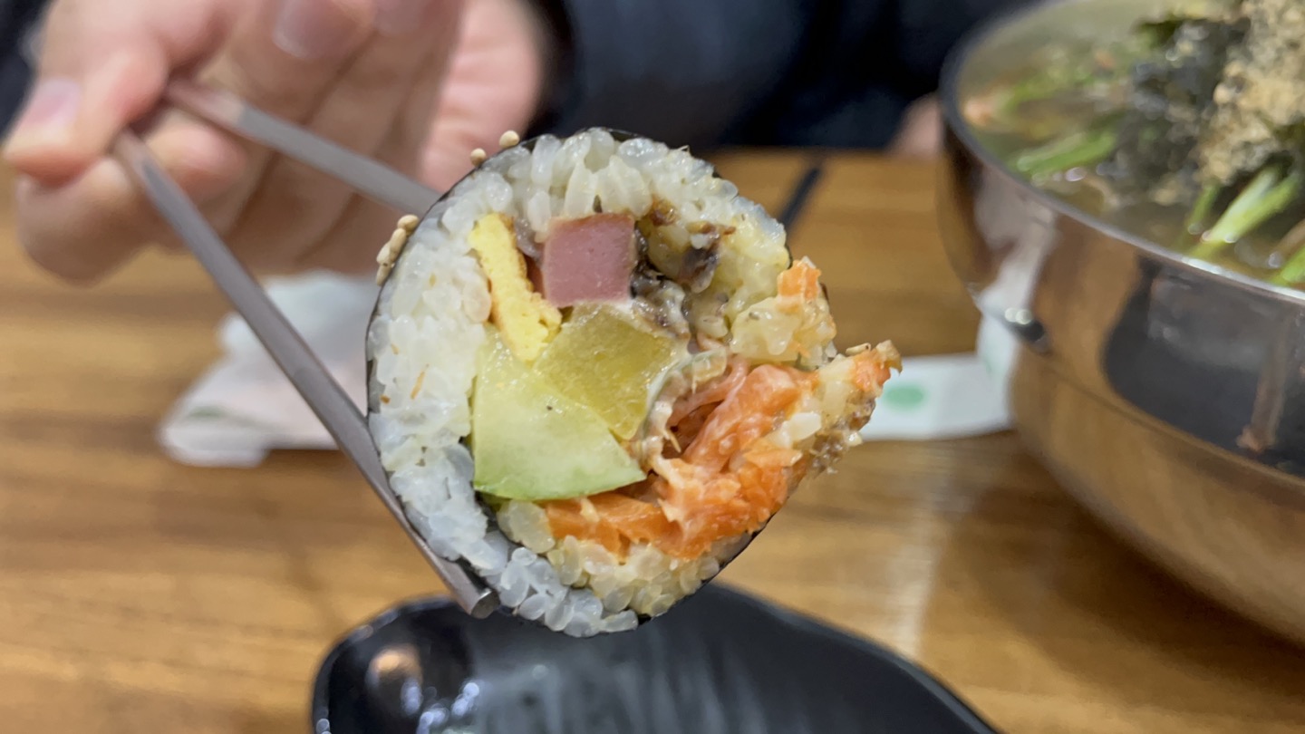 국수를 먹는 사이 멸치김밥도 나왔어요. 멸치 김밥은 처음 먹어보네요
