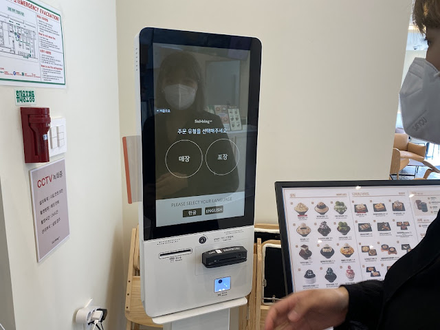 매장에 들어서면 소독과 온도 체크를 할 수 있는 기계가 왼쪽에 있고 주문을 할 수 있는 키오스가 설치 되어있답니다.