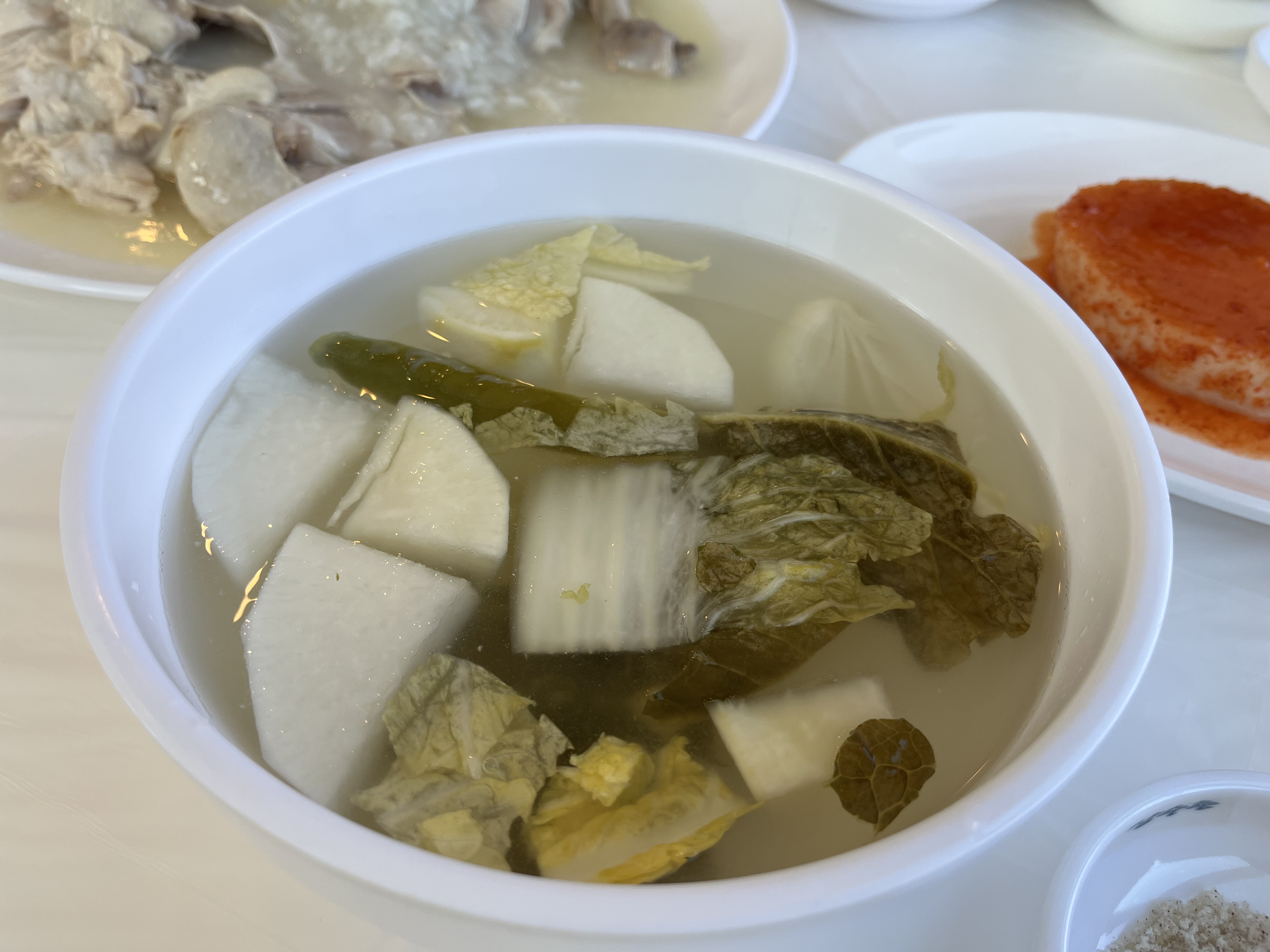 밑반찬으로 무김치, 배추김치, 동치미가 나오는데 무는 단면 통으로 나와서 신기했어요.