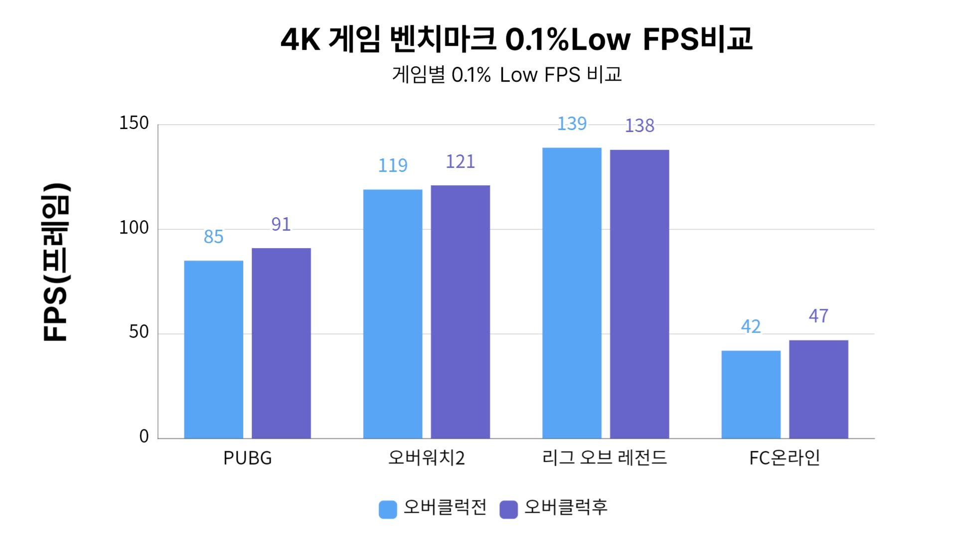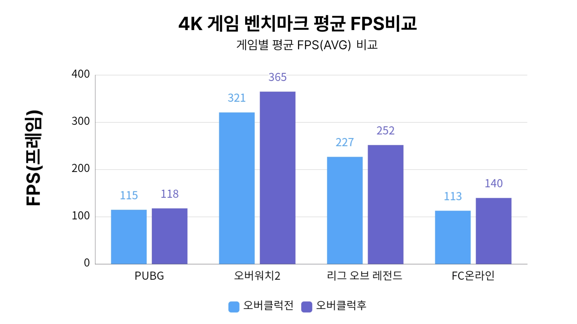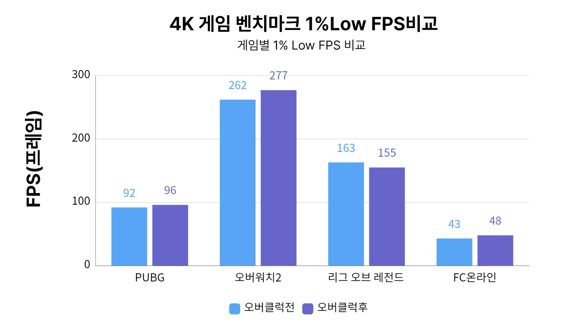 오버클럭 전후 결과를 비교해보면, 전반적으로 프레임이 상승한 것을 볼 수가 있는데, 리그오브레전드와 피파는 클럭 향상 효과가 크지만, 배틀그라운드와 오버워치2는 오버클럭으로 인한 프레임 향상이 크지 않다. 이는 CPU와 그래픽카드에 대한 의존도가 이런 영향을 미치는 것으로 추정된다.