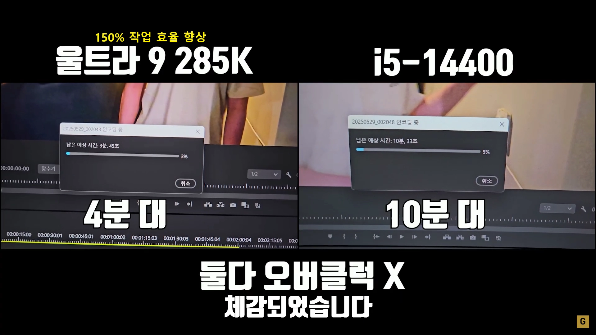 4K 영상 인코딩 기준으로 기존에 사용한 14400 시스템에서 10분 가량 인코딩 시간이 소요되었지만, 285K 시스템의 경우는 4분대로 단축되었다. 무려 150% 이상 작업 효율이 향상된 것이다. 이는 14400에서 3시간짜리 인코딩 영상이라면, 285K에서는 한 시간 정도면 인코딩이 끝나는 것으로 전문적으로 작업을 하는 사용자에겐 매우 큰 차이를 만들어 준다.